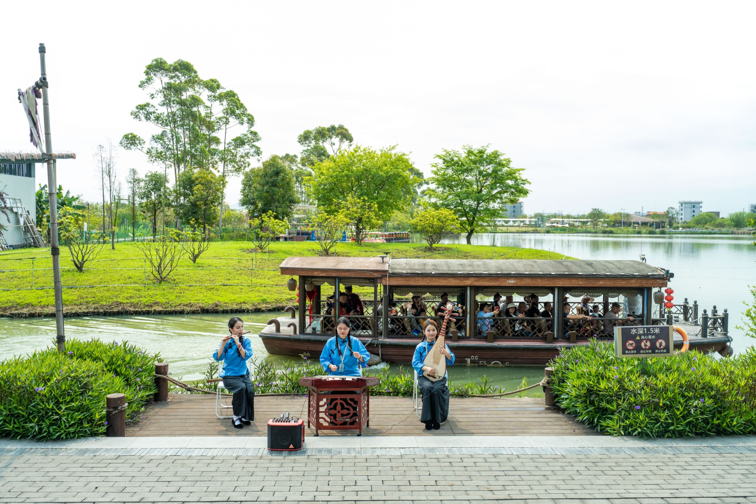 身着汉服的饰演者正在游船上起舞演奏,古筝、笛子、二胡、琵琶等多样民乐秩序演奏,为旅客纯真讲授出“天籁与和洽”。本次民乐献技遏制传统舞台死心,以“移步换景”状貌融入水乡。游船泛波奏响《梦里水乡》,古桥活水间唱响岭南经典。