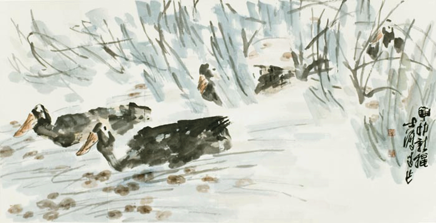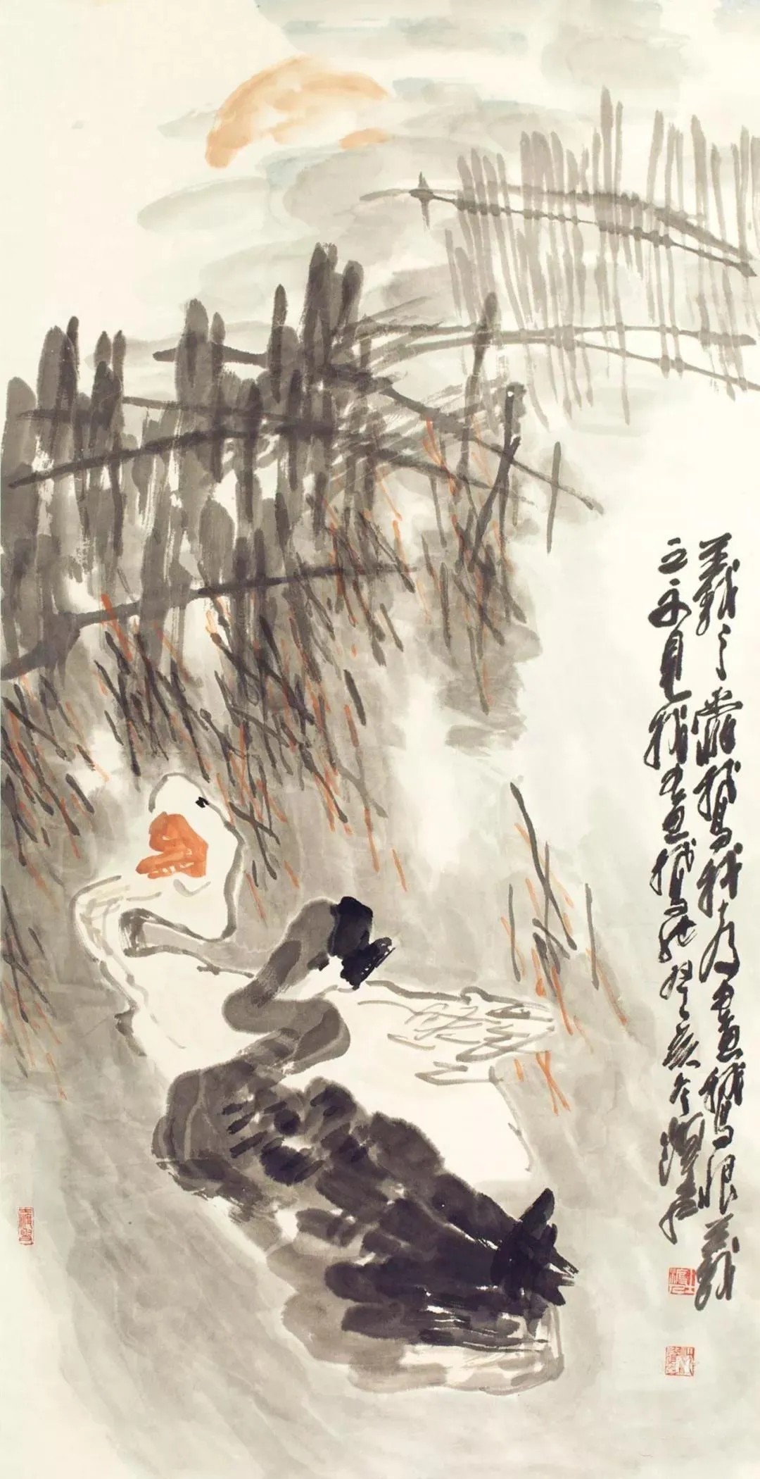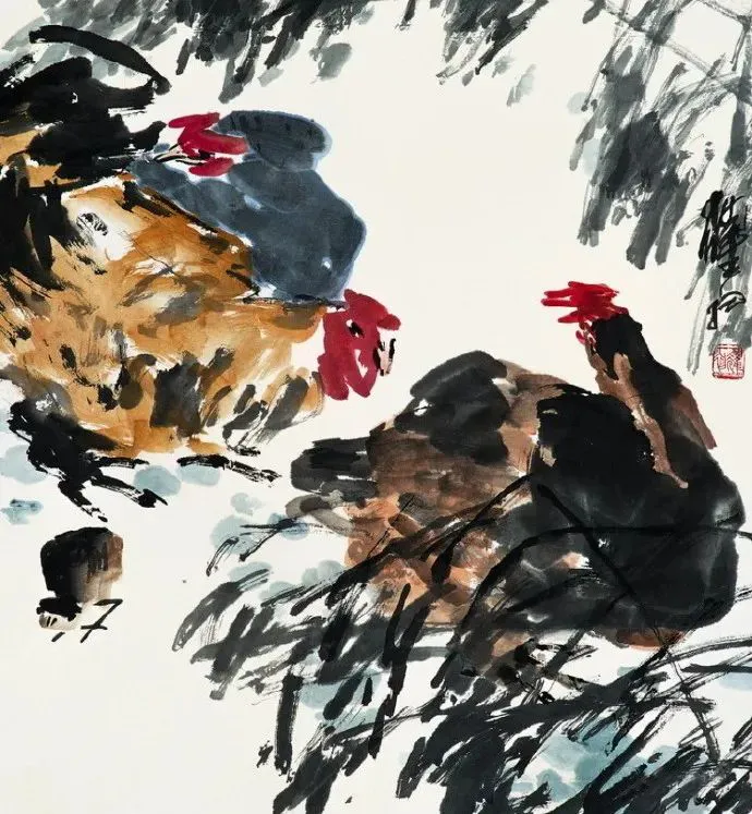 他画墨荷,荷叶不勾边,墨色一泼,旯旮我方晕开,像被雨水打湿的裙摆,当然又活泼。画芦雁,不画羽毛细节,几笔粗线勾画,再用焦墨点出眼睛,那雁儿仿佛能扑棱棱飞起来。最妙的是他画农家小院,竹篱歪七扭八,鸡鸭载歌且舞,连盘中的鱼鲜王人带着热气,看得东说念主直流涎水。