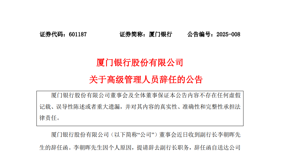 厦门银行副行长李朝日离职